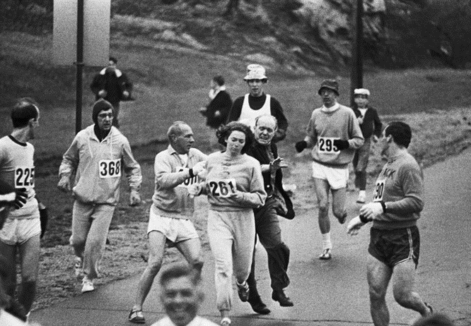 Kathrine Switzer, the first woman to run in the Boston Marathon (1967)